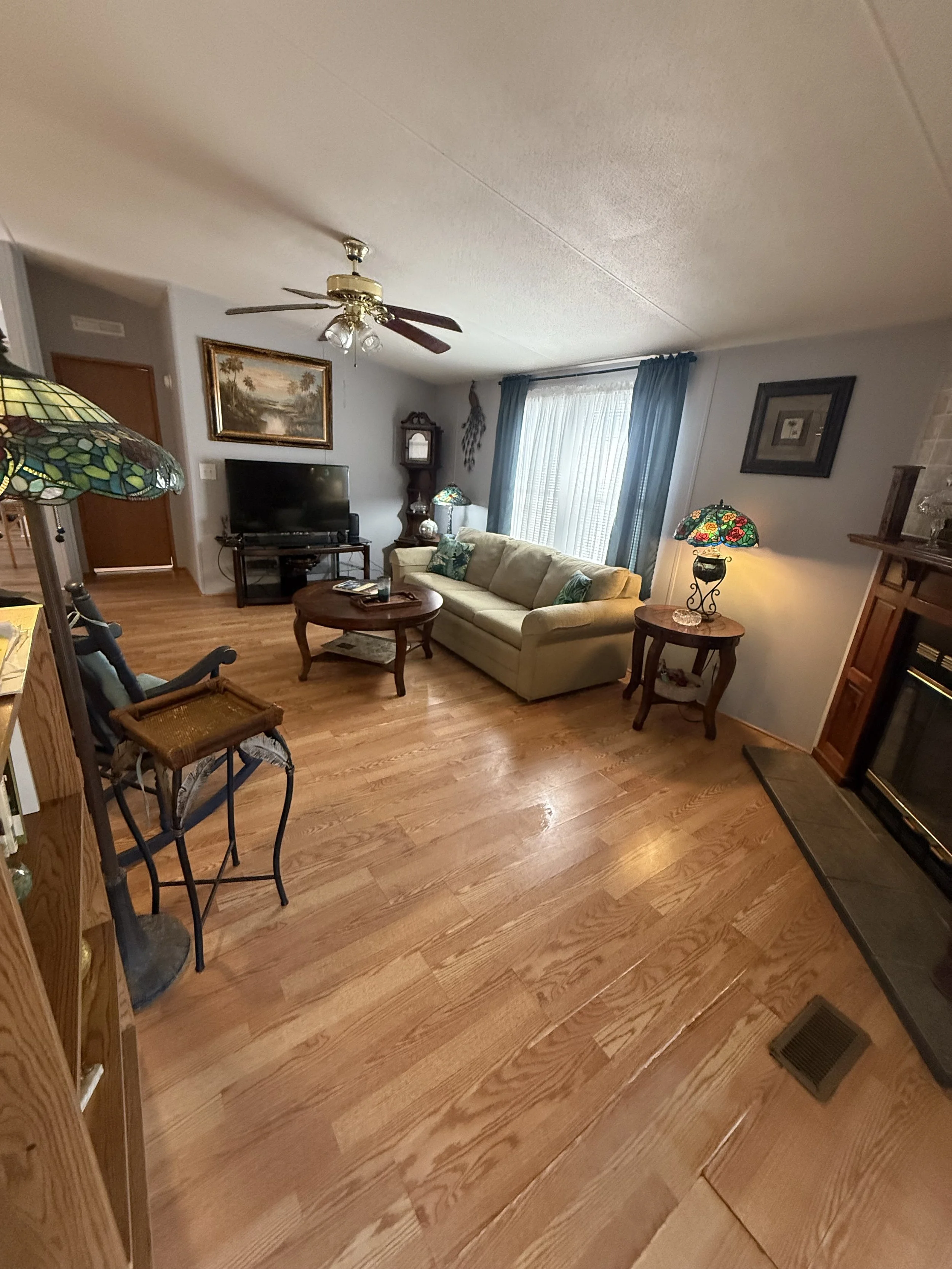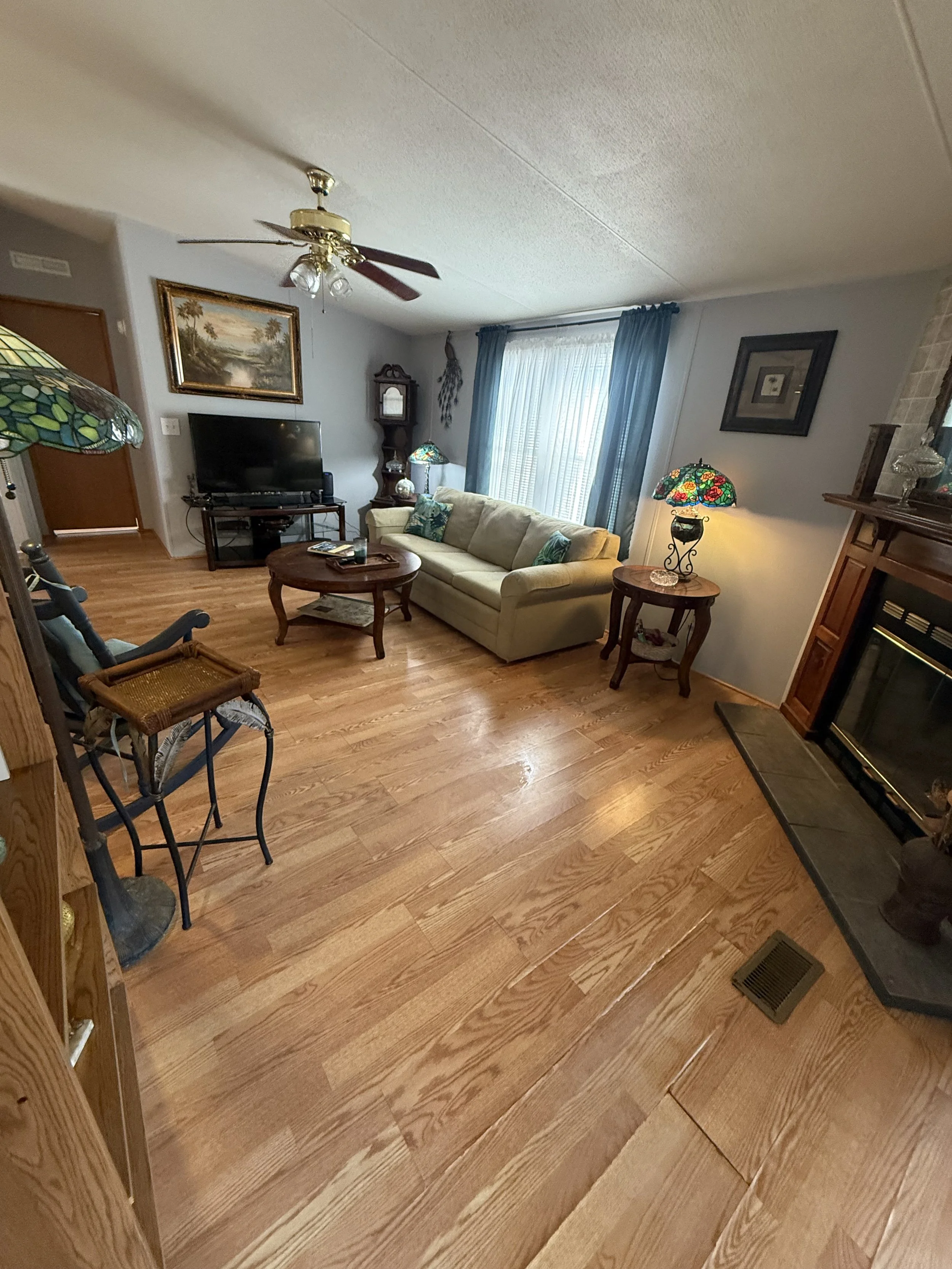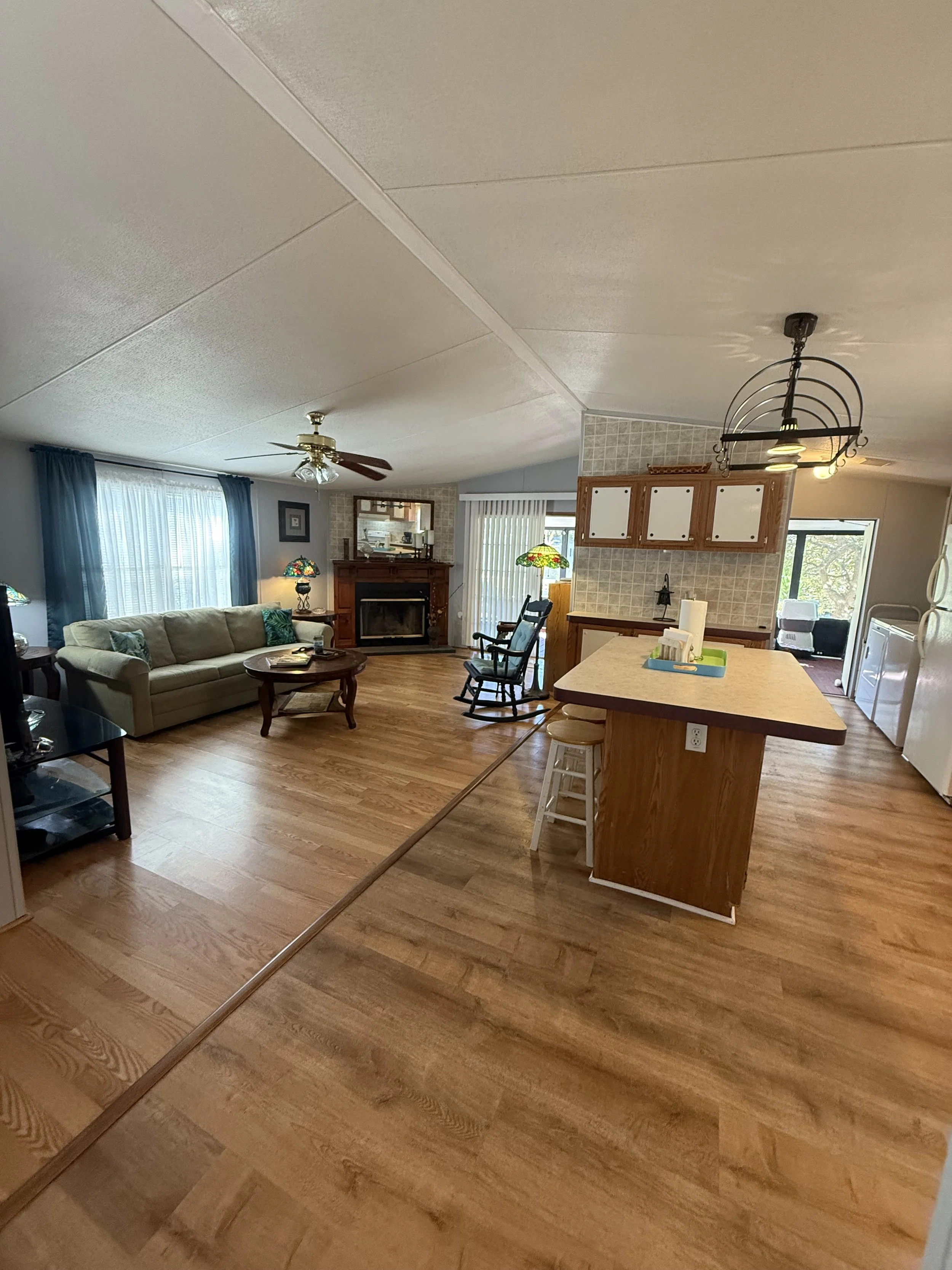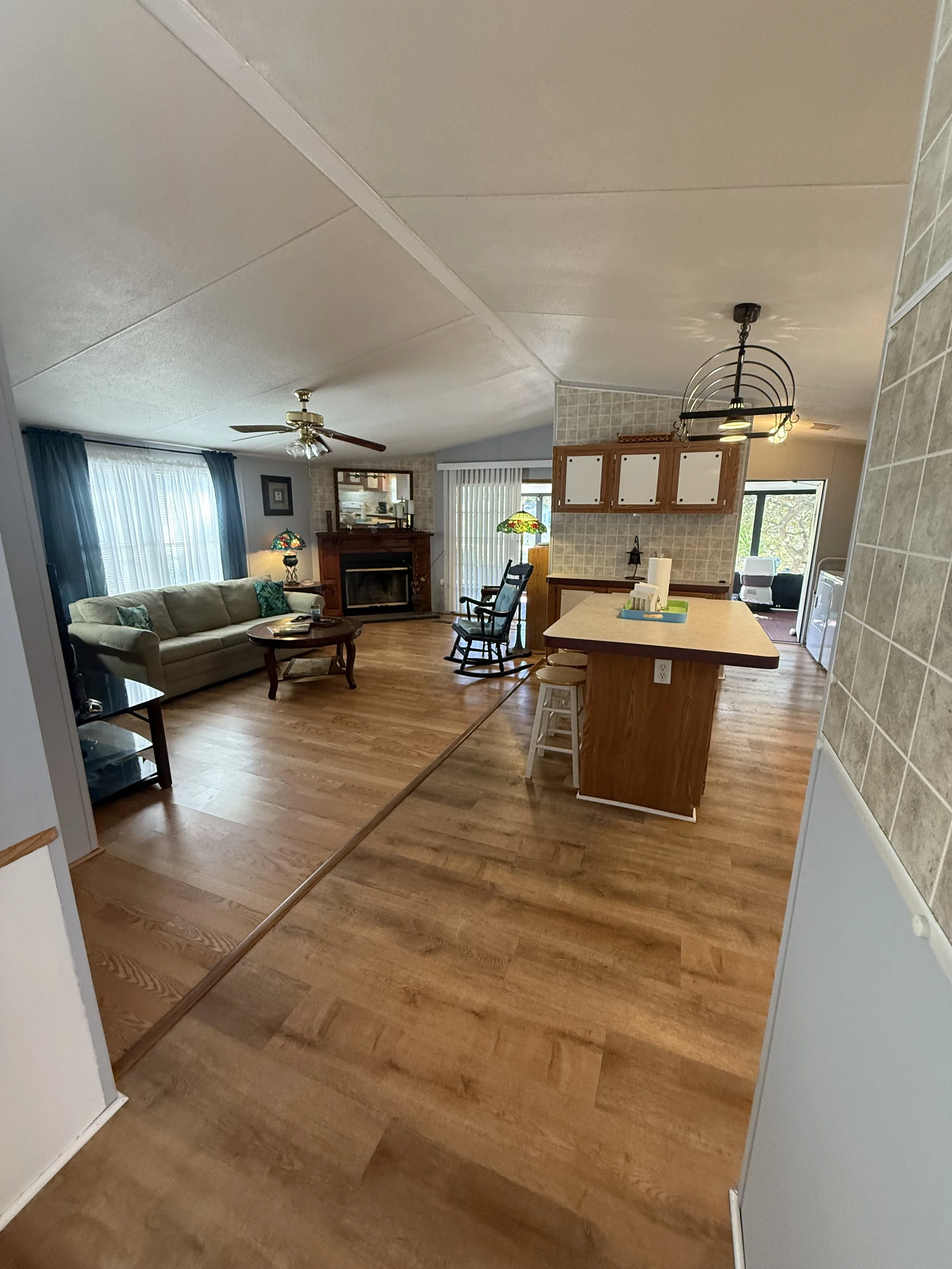 Living room plus den area w/ corner electric fireplace & door to lakefront screened in porch
