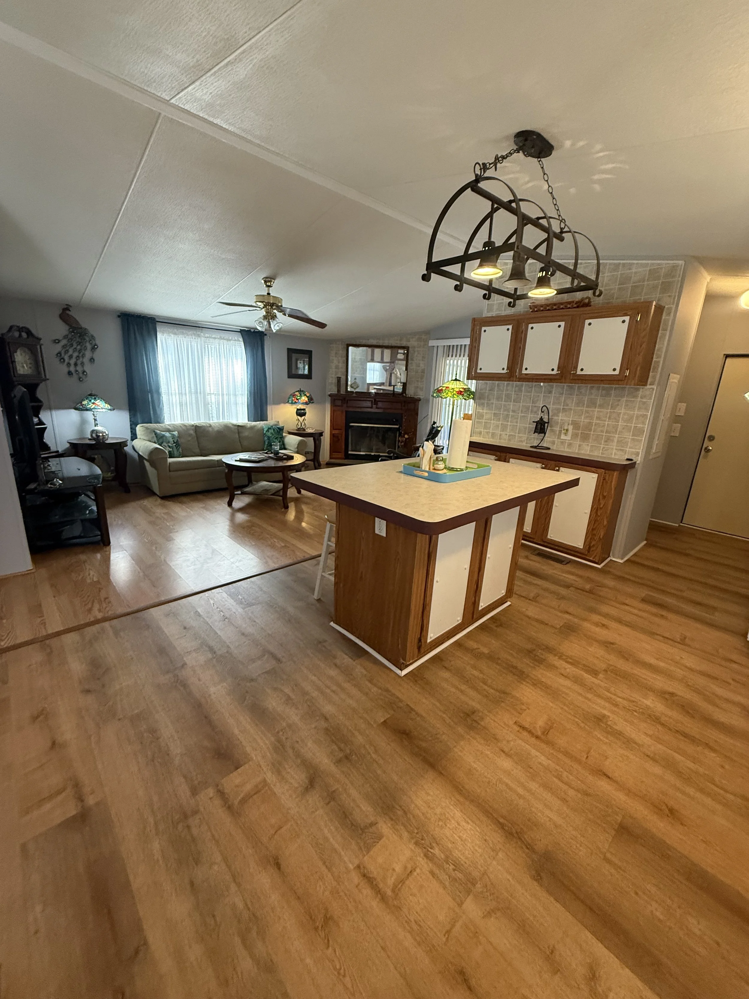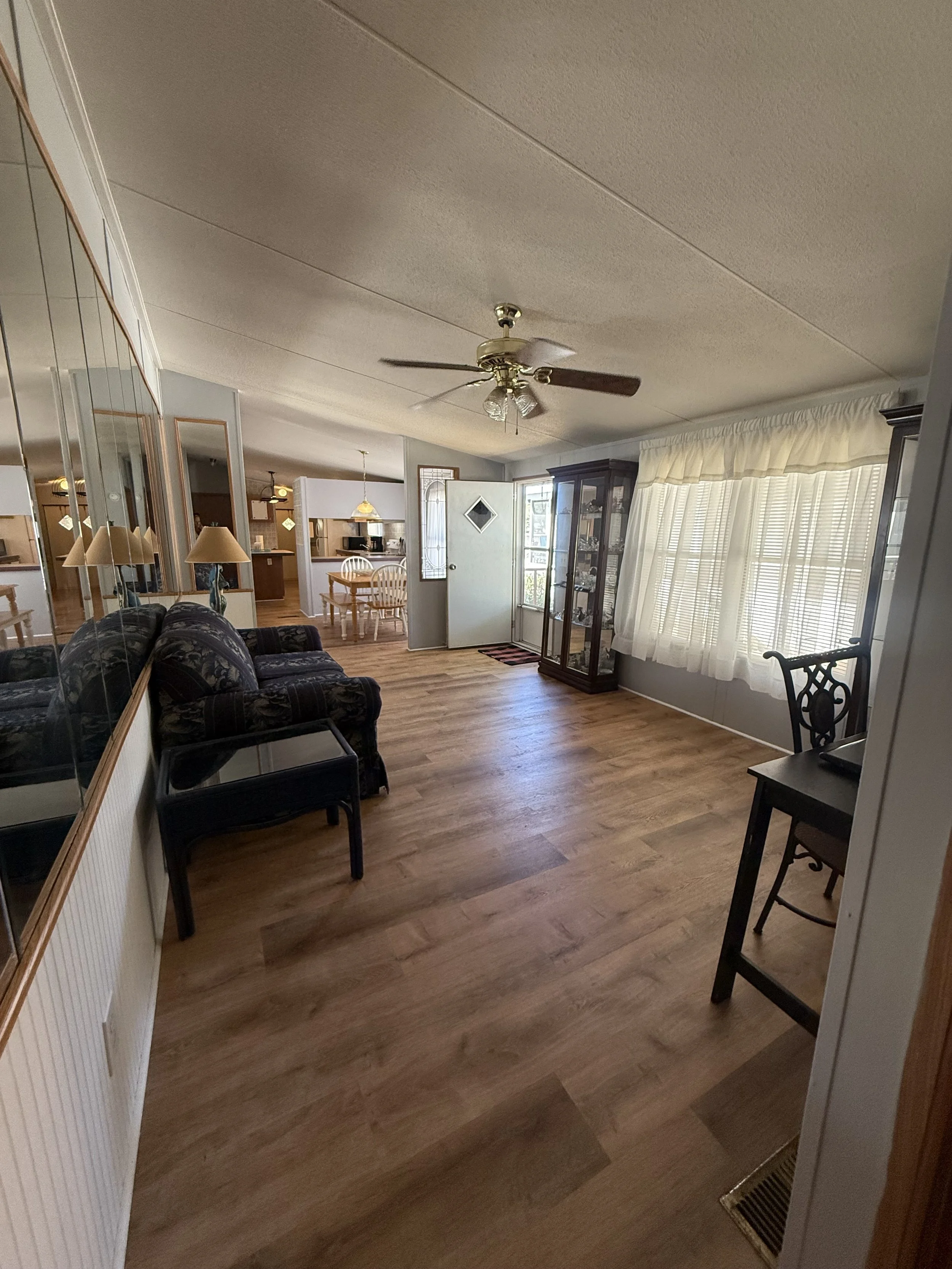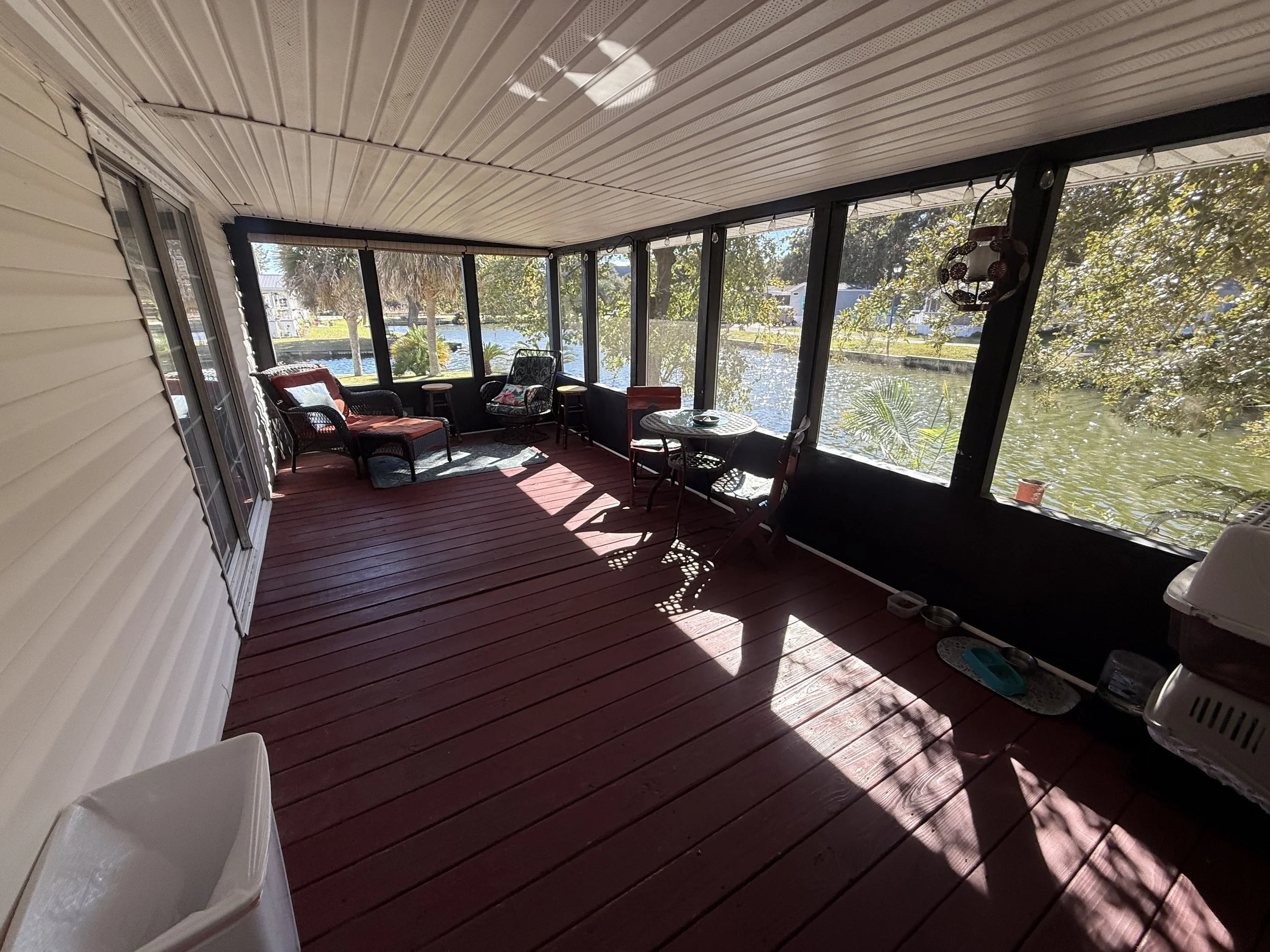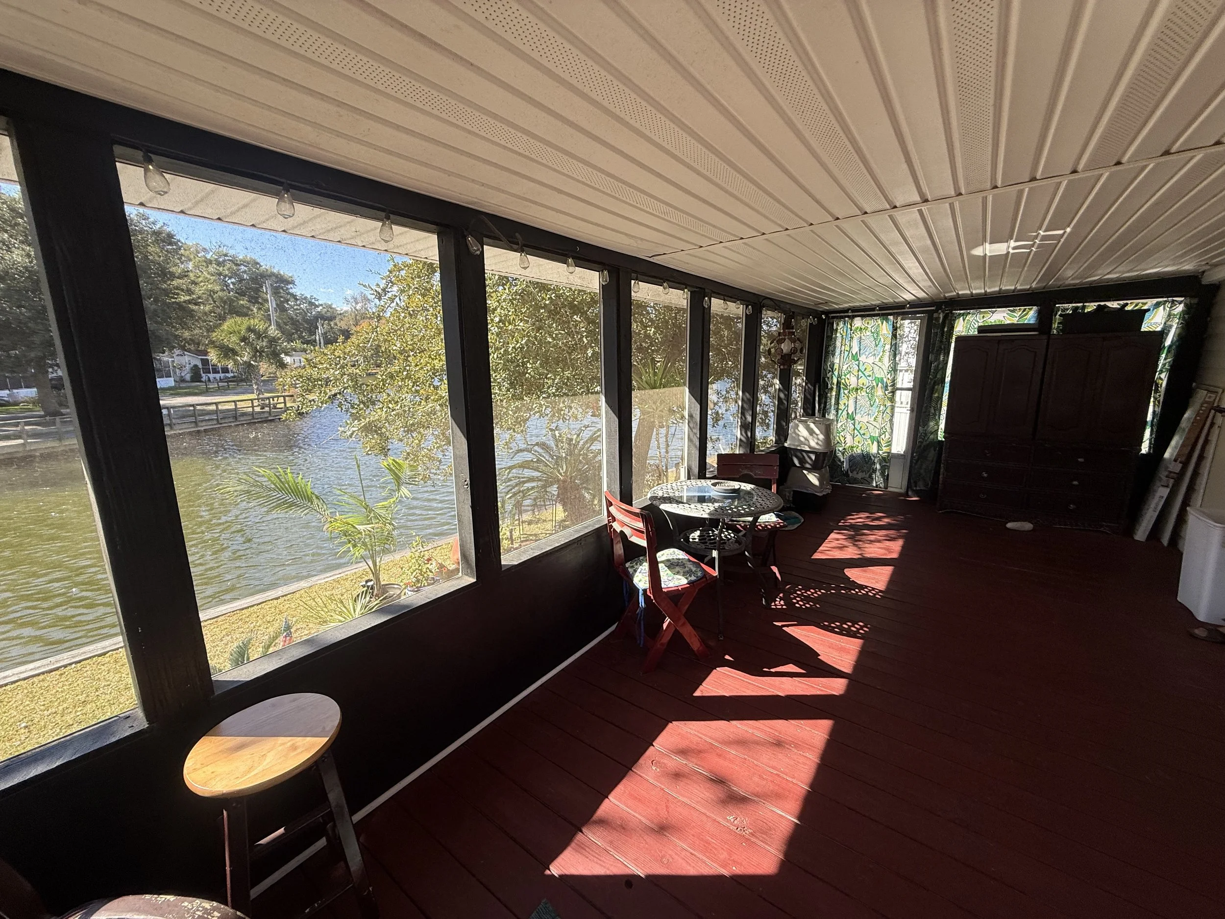 Living room plus den area w/ corner electric fireplace & door to lakefront screened in porch