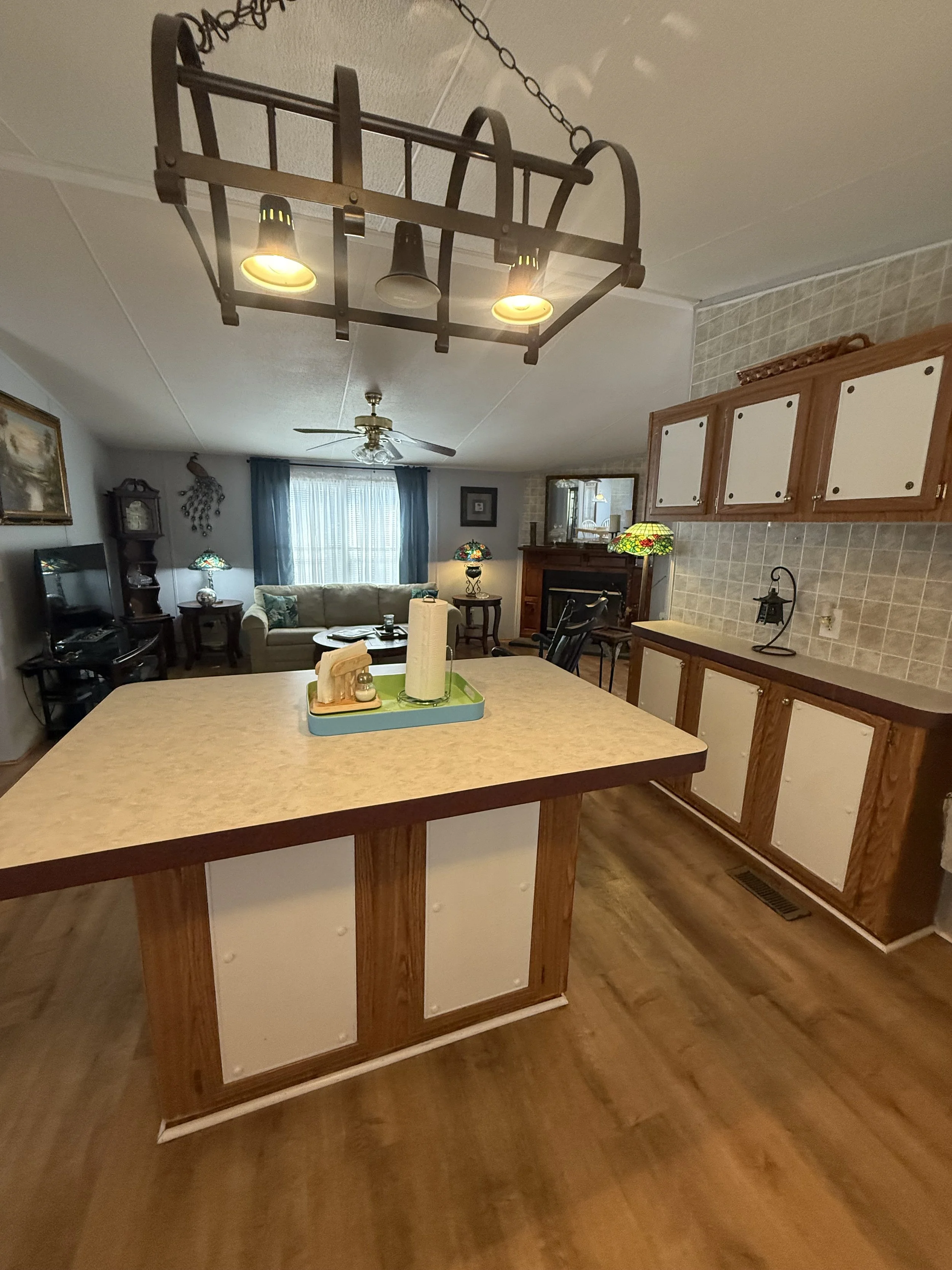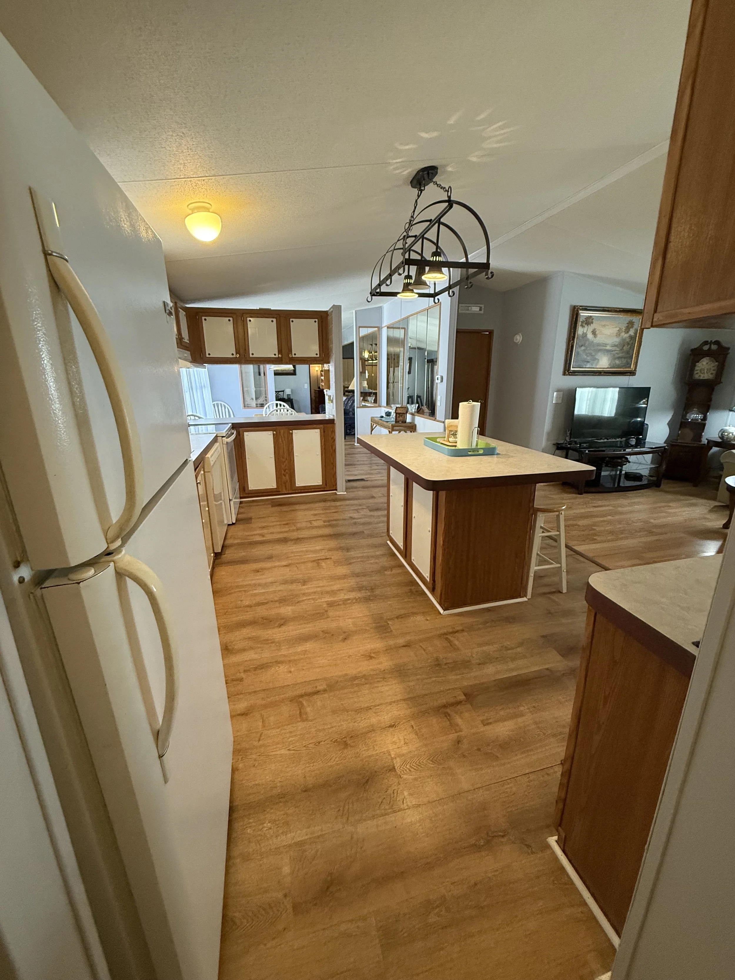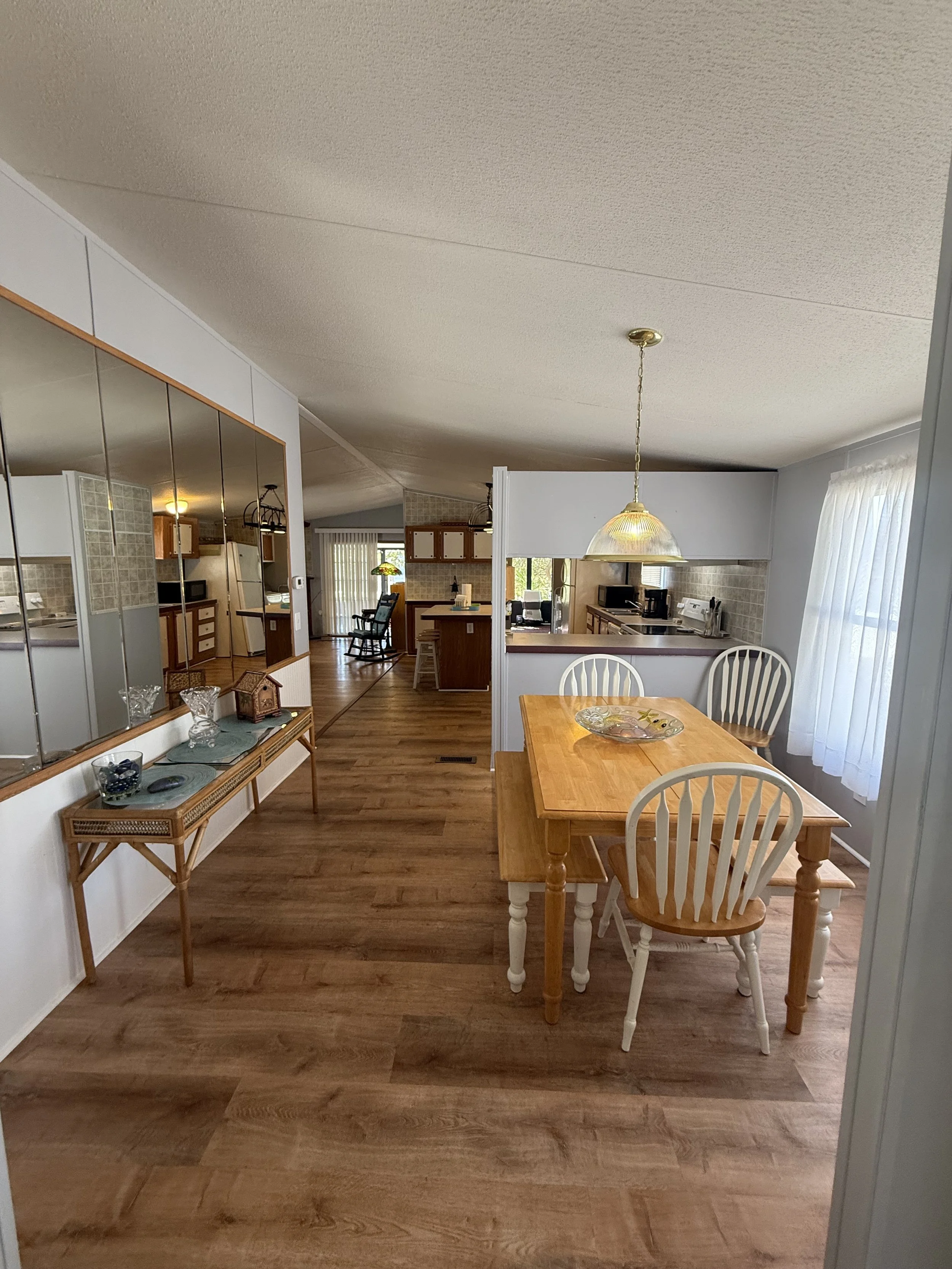 Large open kitchen with island and separate dining room, Vaulted ceilings